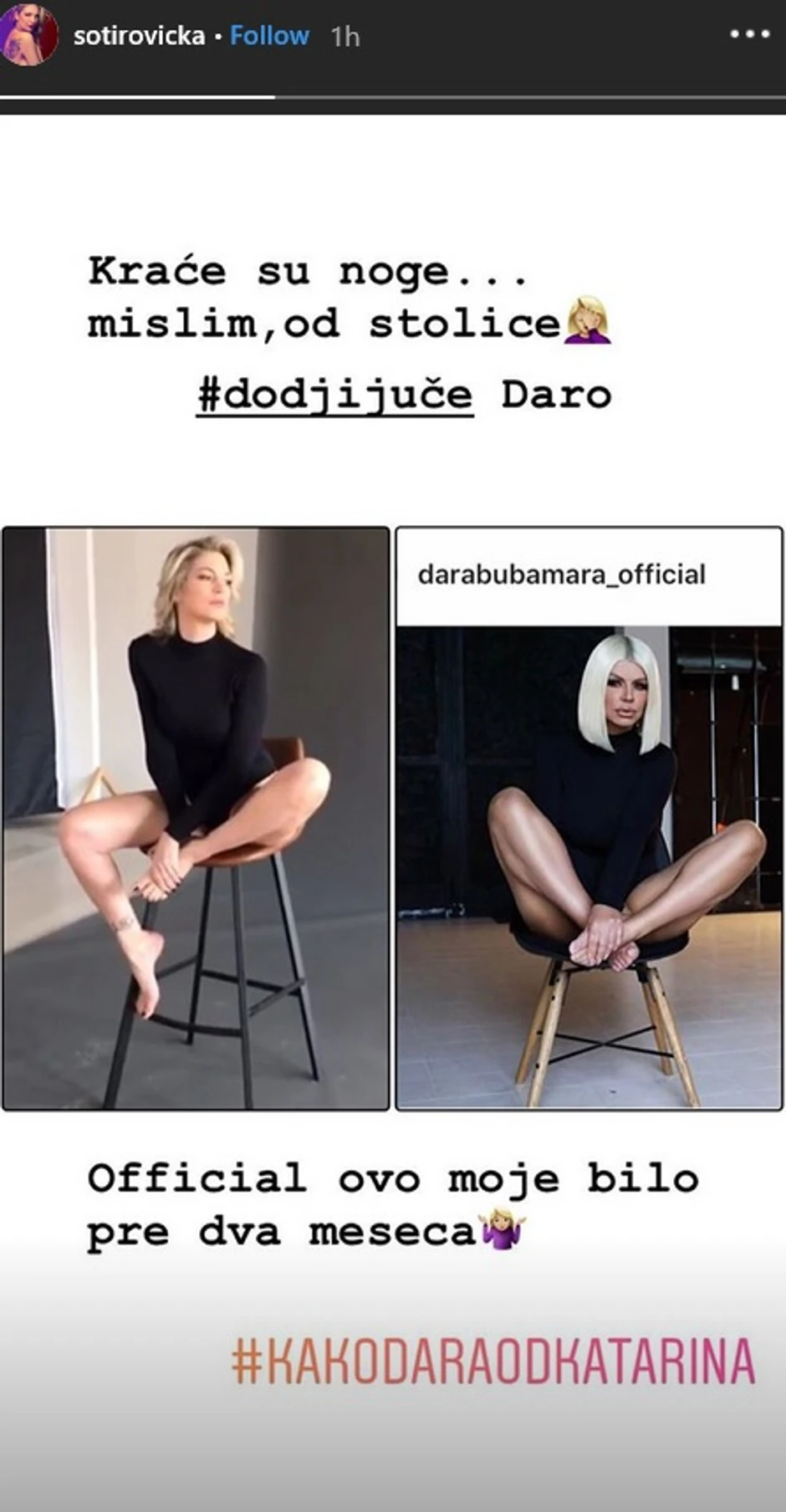 - Kraće su noge... Mislim, od stolice - napisla je Katarina uz njenu i Darinu fotografiju uz haštag "dođi juče Daro", kao i opasku da je ona te fotografije postavila pre dva meseca.