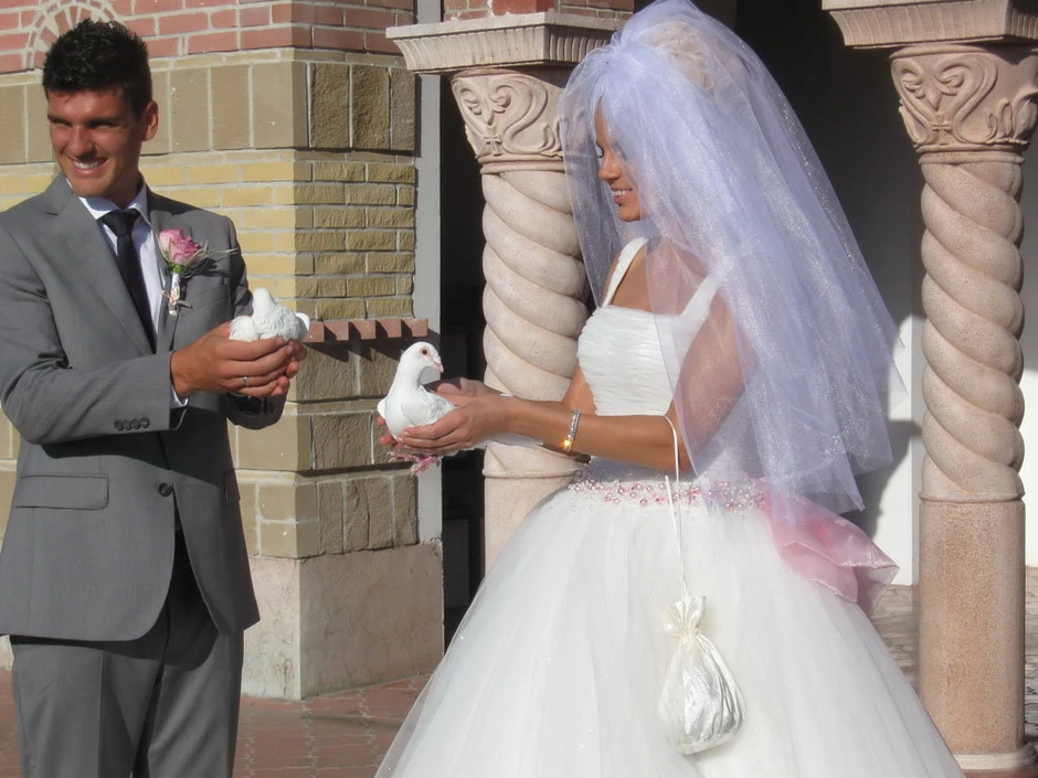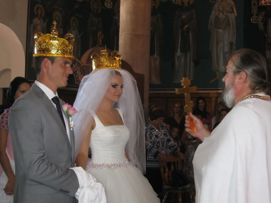 Pred pravoslavni hram Sabor svetih apostola na Dunavu mladenci su stigli u dva fijakera dovezena iz Sombora, sa golubovima poštarima iz Futoga, uz trubače iz Vranja i sa dve zastave - srpskom i kanadskom.