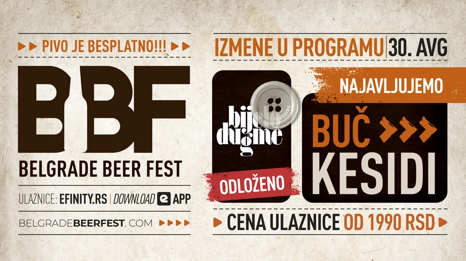 Koncert Bijelog Dugmeta, zakazan za 30. avgust u okviru Belgrade Beer Festa, na inicijativu benda, biće odložen za jesen u Beogradskoj Areni. Novi datum biće uskoro objavljen.