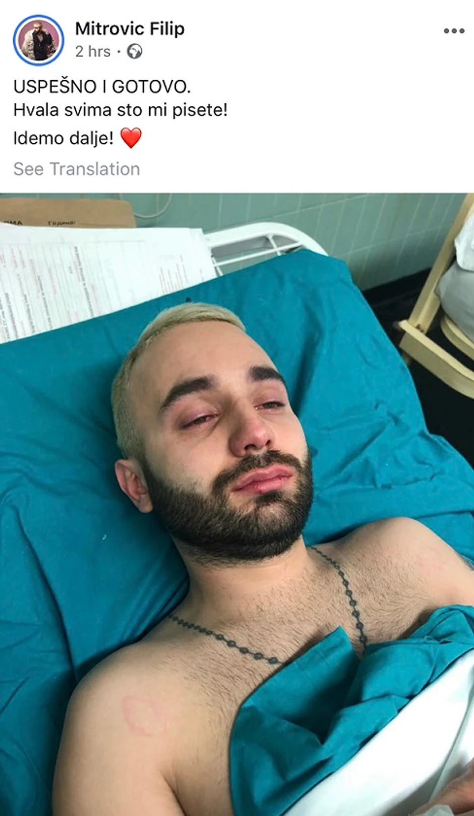 - Uspešno i gotovo! Hvala svima što mi pišete. Idemo dalje - poručio je on iz bolničkog kreveta.