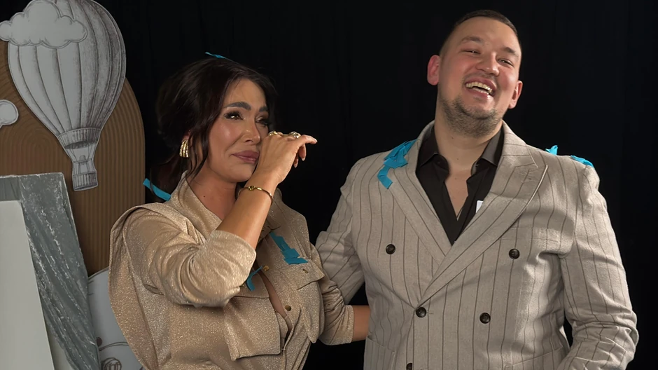 Uroš i njegova devojka stajali su ispred ogromne kutije, kada su iz nje izleteli plavi baloni, što znači da će beba koju čekaju biti dečak.