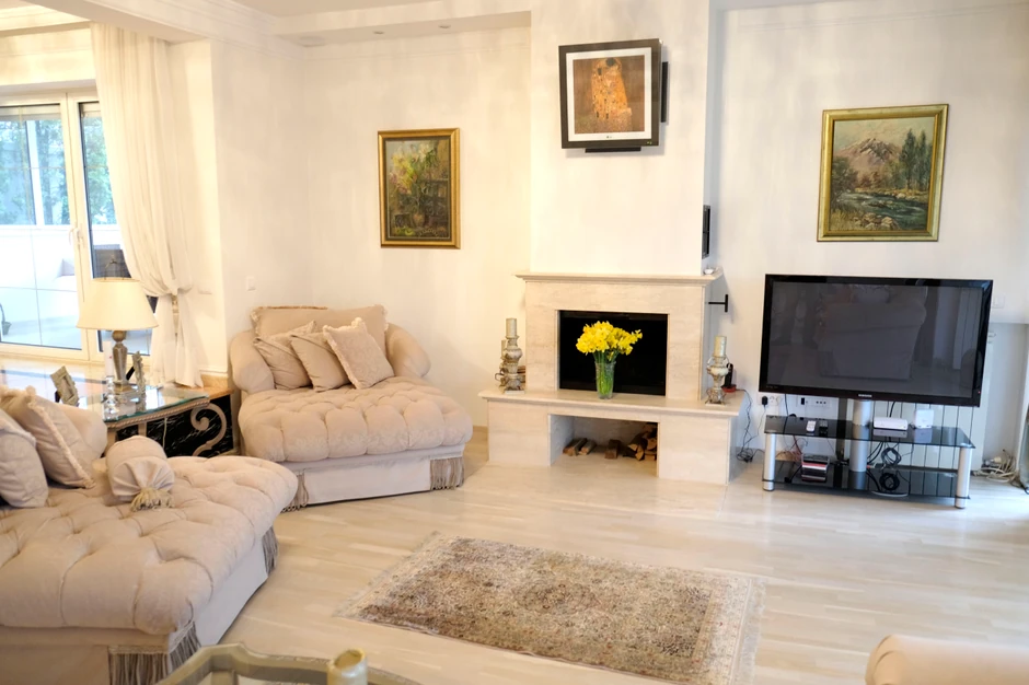 Sanjina kuća u Jajincima odiše luksuzom i pažljivo biranim detaljima. Dnevna soba je prostrana, uređena u nežnim bež tonovima, sa kaminom kao centralnim elementom. Enterijer podseća na dvorce, dok je svaki detalj pažljivo uklopljen, što dodatno naglašava eleganciju prostora.