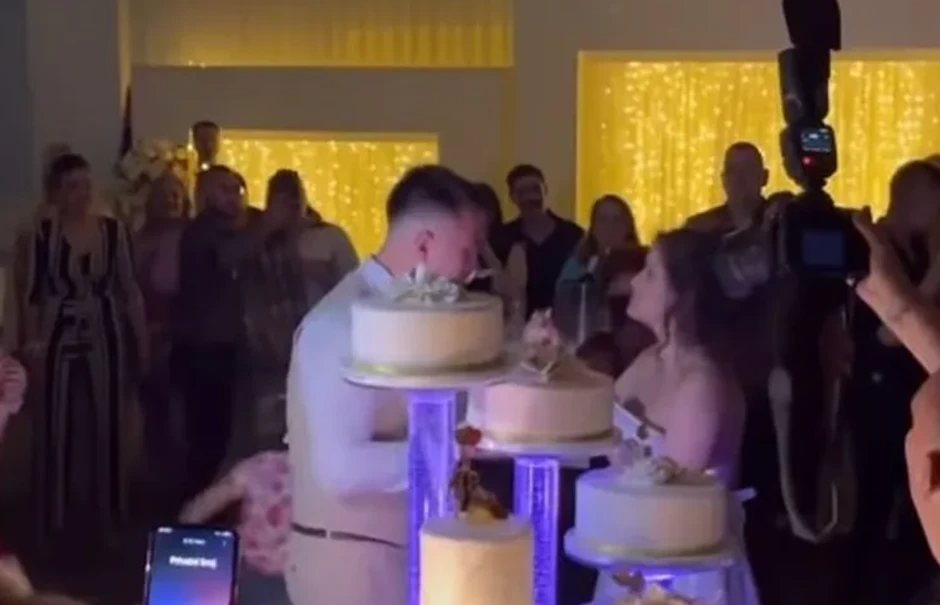 Pored torte na tri sprata, mladenci su imali sa strane još četir i manje torte, a tokom prvog blesa salu je prekrio beli dim.
