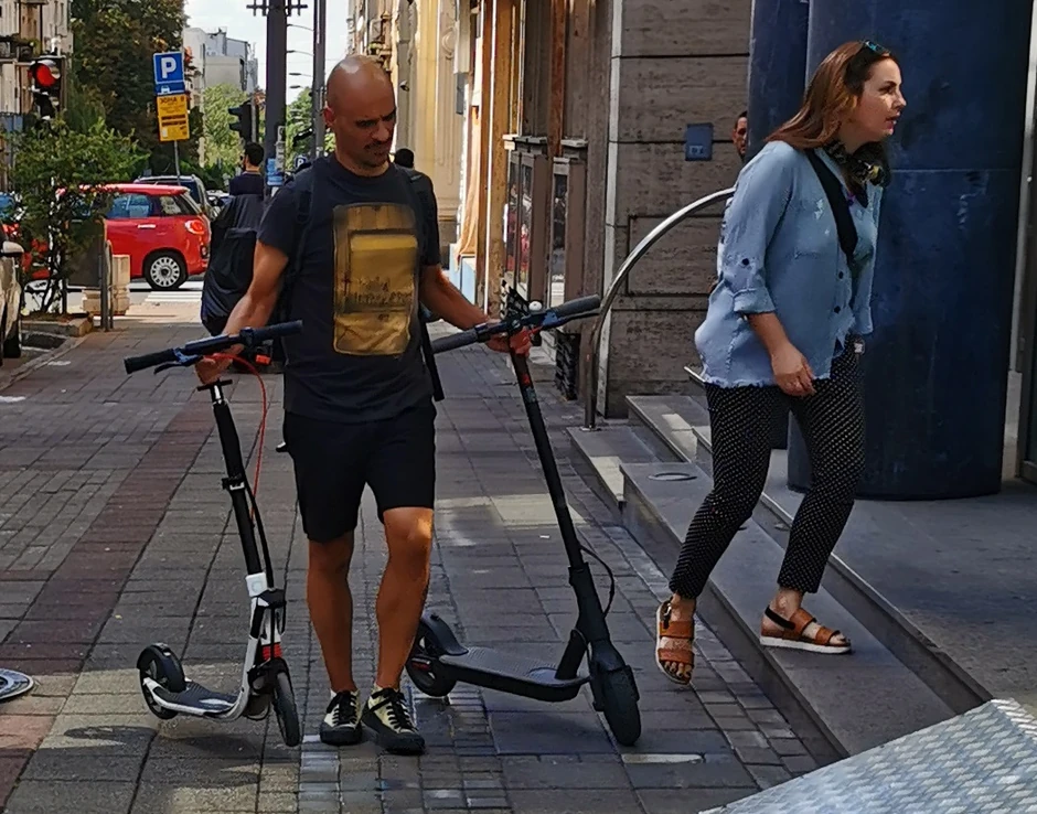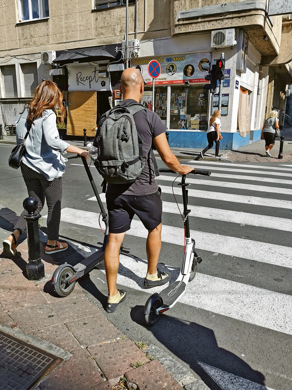 Novom trendu vožnje električnih trotineta podlegao je i glumac Ivan Jevtović, i to porodično. Uslikali smo ga kako sa suprugom prelazi ulicu na pešačkom prelazu, a oboje su motorizovani.