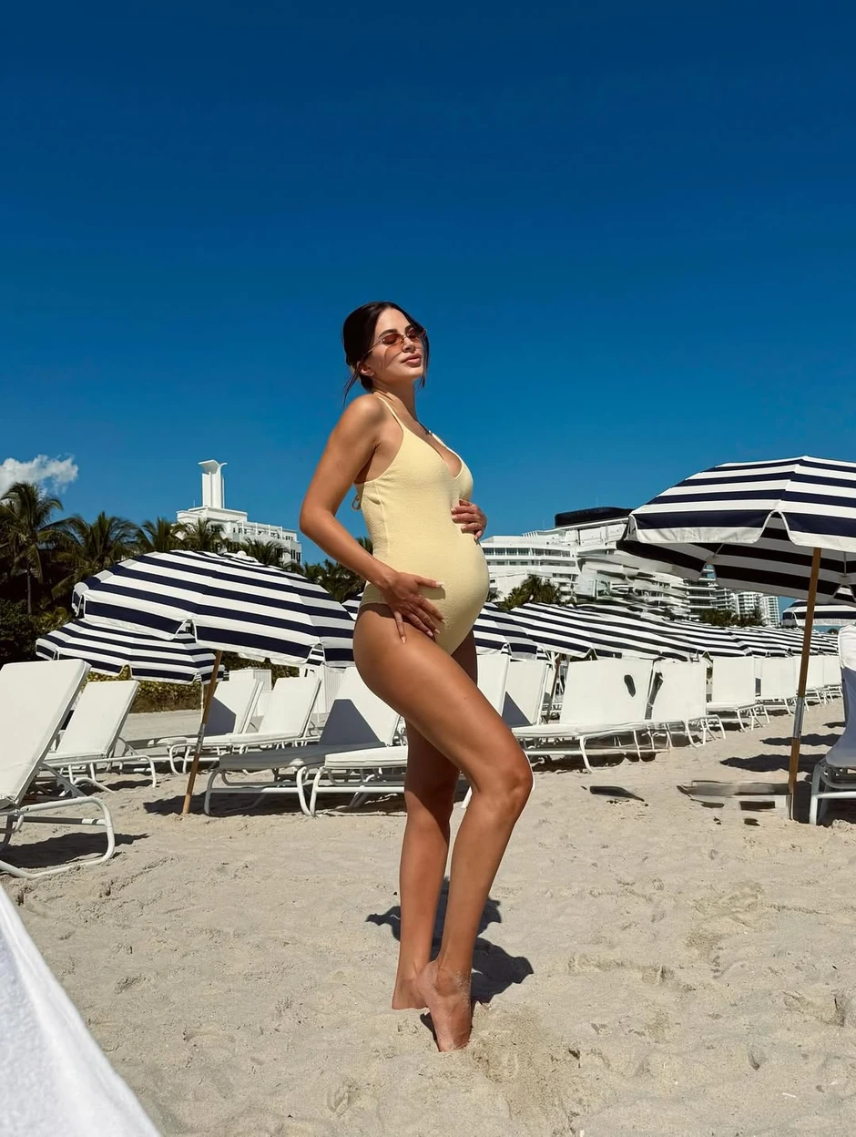 Pevačica je bila u jednodelnom žutom kupaćem kostimu, a kako možemo videti ona je u poodmakloj trudnoći.