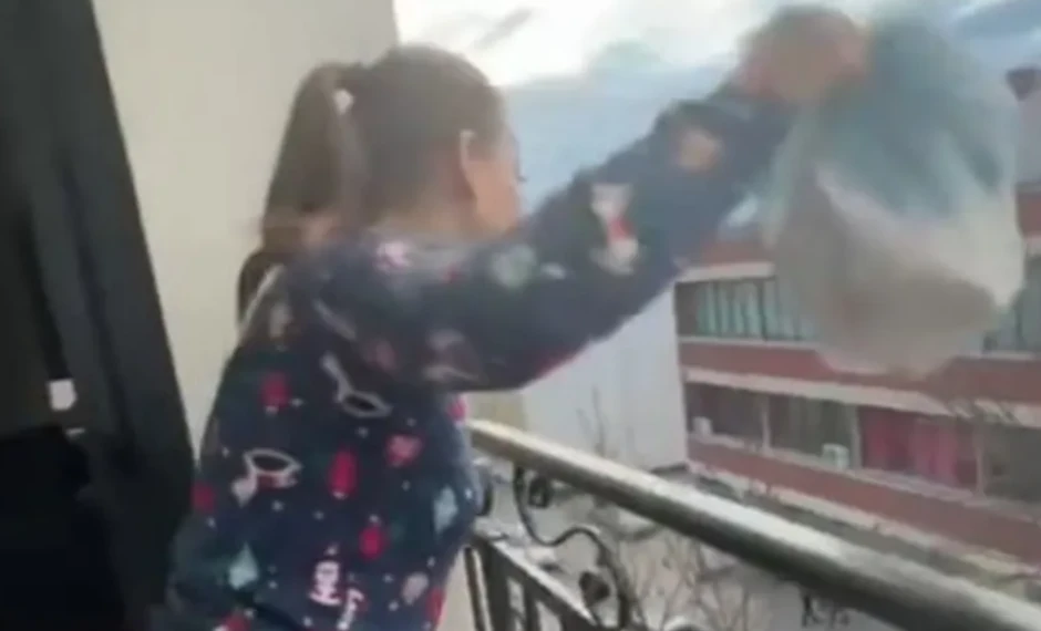 Na snimku koji je Sanja podelila na TikToku, vidi se kako sa terase direktno radnicima gradske čistoće ispred zgrade baca stvari.