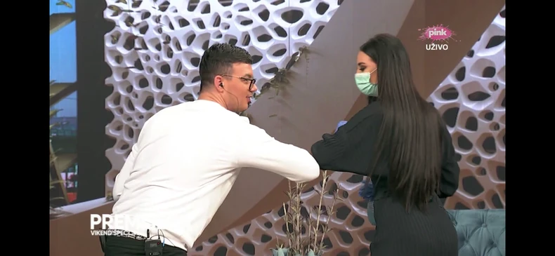 Katarina je, naime, u emisiju "Premijera" ušetala sa rukavicama i maskom na licu, te je odmah i voditelja isprskala dezinfekcionim sredstvom. Ona je istakla da se ne plaši, ali da moramo da budemo oprezni.