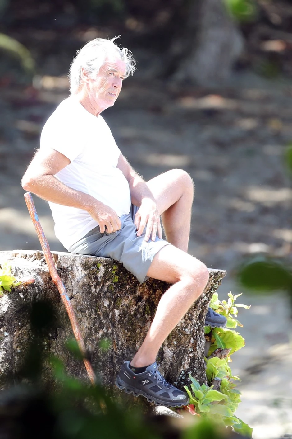 Miljenik žena tokom boravka na ostrvu obrijao je bradu i tako mnoge pripadnice nežnijeg pola iznenadio. Brosnan je u ponedjeljak viđen kako sam ide u šetnju po Havajima i pritom je nosio običnu belu majicu i bermude, a u rukama je imao štap za pomoć pri hodanju.