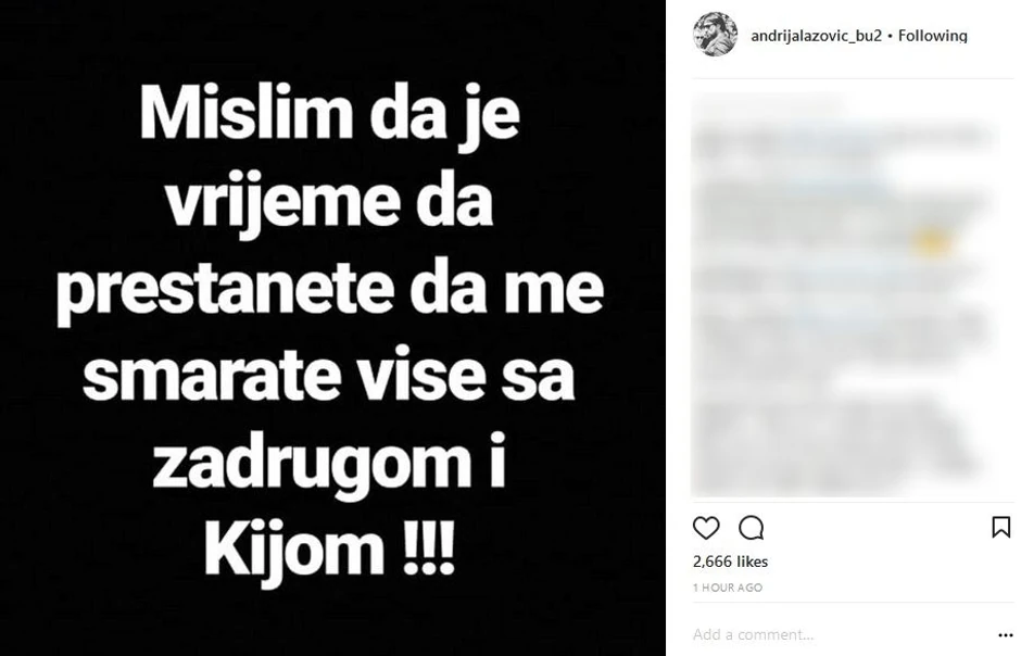 - Mislim da je vreme da prestanete da me smarate više sa Zadrugom i Kijom - poručio je on oštro putem Instagrama.