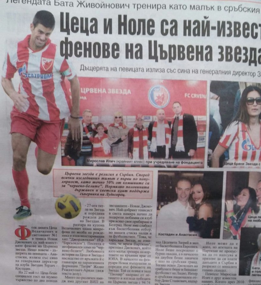 - Folk diva Ceca Veličković i svetski broj 1 u tenisu Novak Đoković najpoznatiji su navijači Crvene zvezde. A uz to, ćerka pomenute pevačice, Anastasija, izlazi sa Kostadinom, sinom generalnog direktora kluba. Tokom boravka na rođendanskom slavlju Zvezdana Terzića u maju ove godine, na kome je proslavljena i Zvezdina titula, pevačica se, na molbu slavljenika, dohvatila mikrofona i zapevala "Đurđevdan", pesmu koja je nezvanična himna crveno-belih. Ljubavna istorija Cece i Zvezde počinje još ranije, kada i njena veza sa pokojnim Željkom Ražnatovićem - piše bugarski list i osvrće se na Novaka Đokovića.