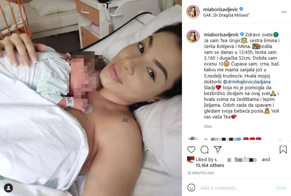 Pevačica Mia Borisavljević danas je na svet donela drugu ćerku, a oglasila se prelepom fotografijom iz porodičišta, na kojoj bebu drži na grudima.