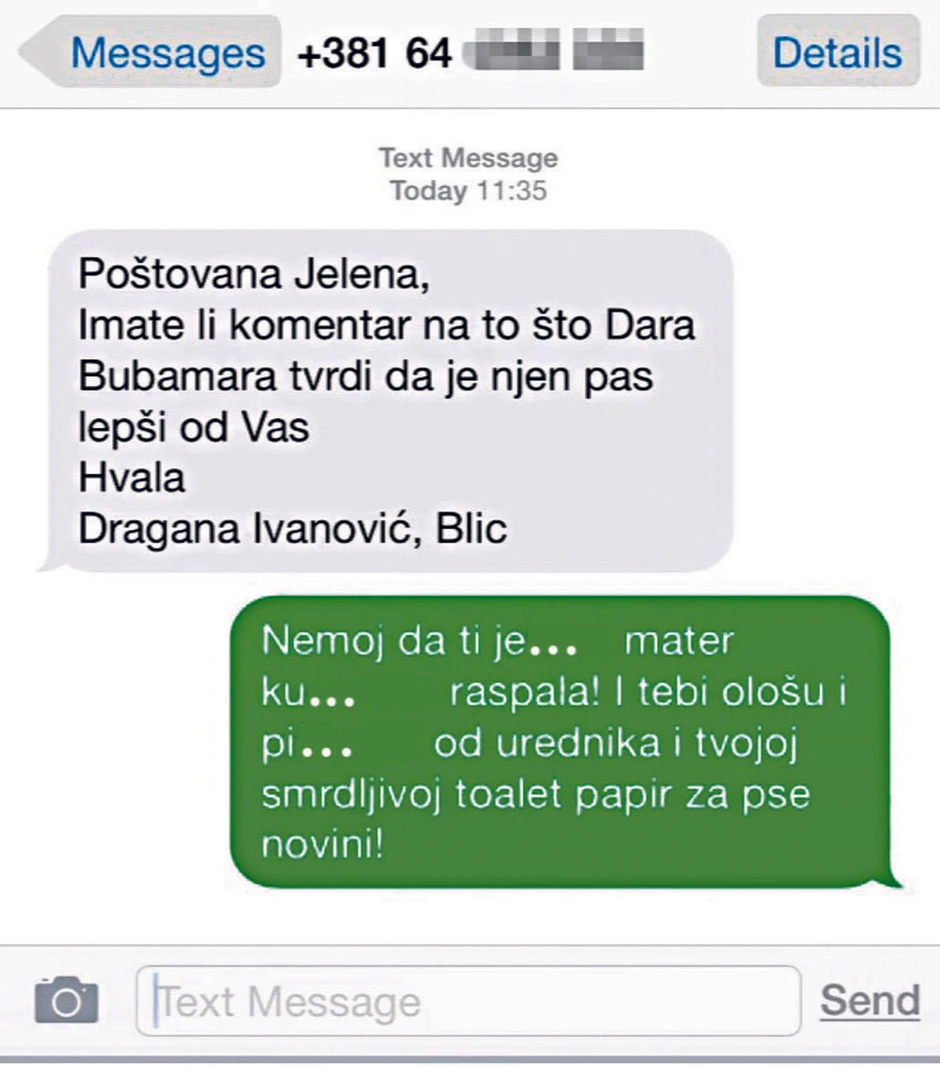 - Slušaj me ti, slušaj me. Nemoj više nikad da se za*ebeš da mi pošalješ poruku. Nećeš dobro proći, je l‘ ti jasno! Nemoj da ti to bude poslednje - vikala je Jelena u slušalicu nekoliko minuta, a onda je, u svom maniru, prekinula vezu.