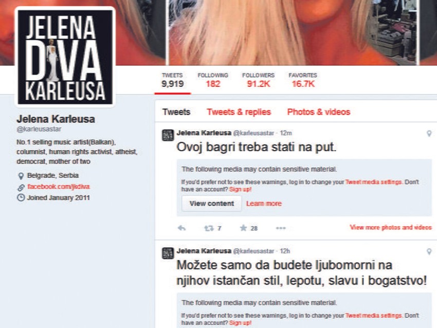 Ovako neobjašnjivo, ali vrlo zabrinjavajuće ponašanje Karleuše traje duže vreme i očigledno se nije oporavila od koncertnog fijaska na Ušću 2013. pred nekoliko hiljada ljudi. Inače, Jelena za sebe voli da kaže da je „zrak svetlosti u poseljačenoj Srbiji“. U redu je imati visoko mišljenje o sebi, ali to, kao ni psovke i uvrede, nije nikada spaslo nečiju karijeru koja tone, pa neće ni njenu.