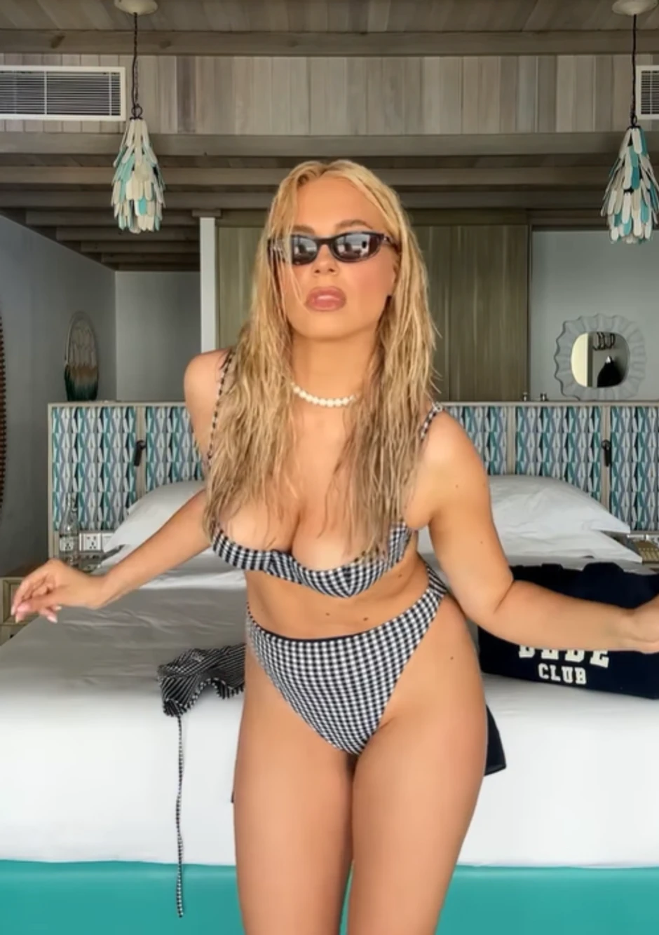 Njene rasne obline nikoga nisu ostavile ravnodušnim, a prirodne grudi jedva su stale u gornji deo bikinija, dok je donji deo kupaćeg podigla do struka.