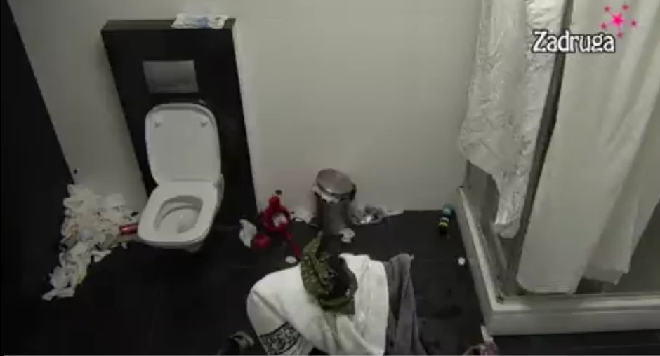 Na snimku se jasno vidi gomila iskorišćenih papirnih maramica u ćošku pored WC šolje i puna kanta za smeće. Limenke i ambalaže razbacane su svuda su po podu, kao i prljava odeća zadrugara oko tuš kabine.