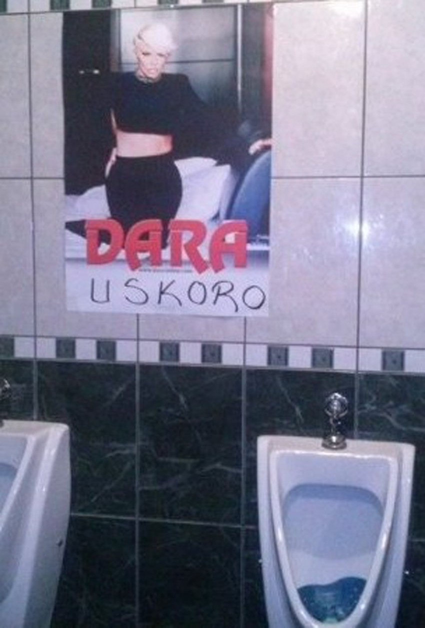 Naime u muškom toaletu jedne diskoteke, iznad pisoara zalepljen je plakat kojim se najavljuje nastup Dare Bubamare.