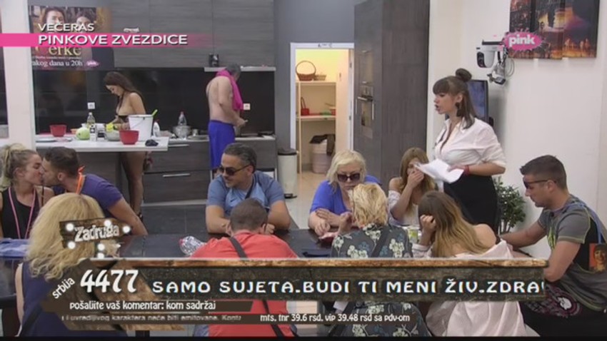 Za glavnu nagradu od 50.000 evra i dalje se bori 24 finalista - Maca Diskrecija, Luna Đogani, Bane Čolak, Sara Reljić, Andrijana Radonjić, Anđelo Ranković, Teodora Džehverović, Bora Santana, Milan Milošević, Sloba Radanović, Sanja Stanković, Vojke Đans, Đekson, Lepi Mića, Marko Miljković, Jovana Tomić Matora, Ana Korać, Kristina Kockar, Gordana Džehverović, Miljana Kulić, Marija Ana Smiljanić, Radosav Stafnović Žuti i Zorica Marković - a samo publika SMS glasovima odlučuje ko će trijumfovati u prvoj sezoni rijalitija "Zadruga".