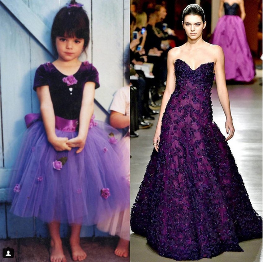 Na slici je Kendal Džener obučena u ljubičastu haljinicu, sa držanjem odrasle osobe, a tu je i novija fotografija sa revije na kojoj je nosila toaletu slične boje.