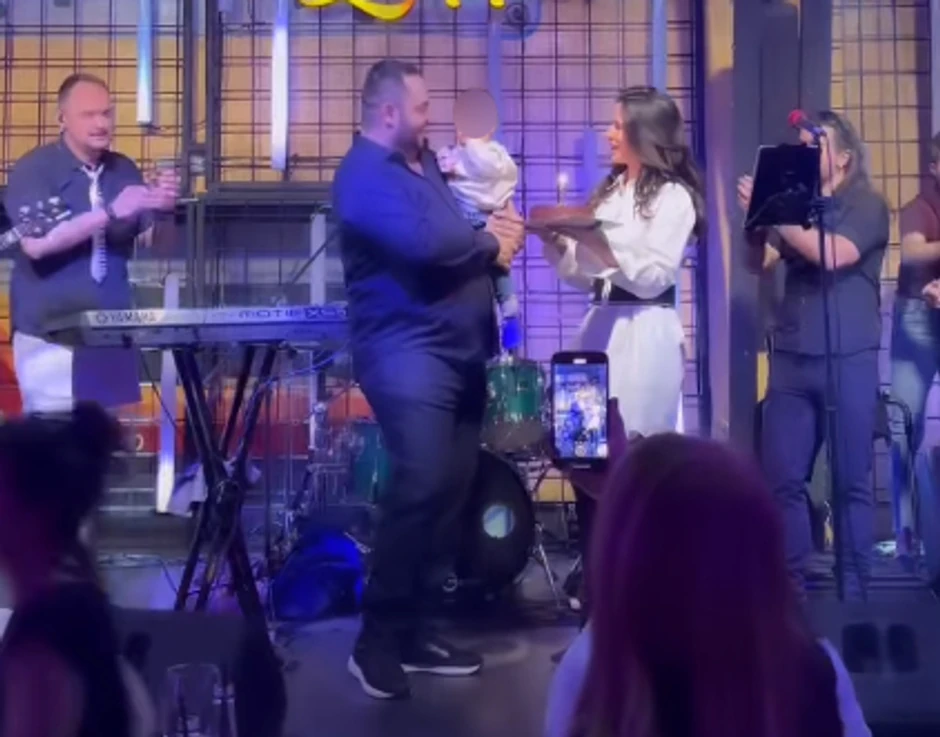 Naime, njen suprug Marko je naslednicu držao u naručju, Sajsi je iznela tortu na binu pa su svi zajedno oduvali svećice. Ona je bila sva u belom kao i naslednica, a čestitke su se nizale.