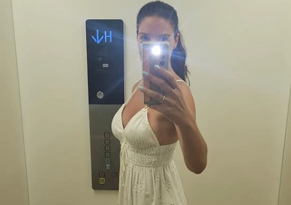 Sanja je prvo pozirala u providnoj haljini za plažu dok je sina vozila u kolicima, a potom je objavila selfi iz lifta dok je na sebi nosila belu dugu haljinu sa skroz golim leđima i dekolteom.