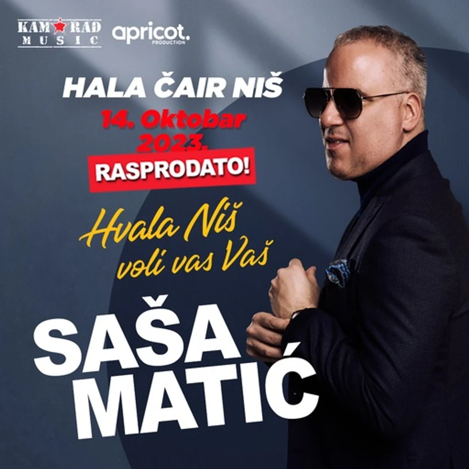Folk zvezda Saša Matić rasprodato je halu Čair u Nišu, za koncert koji će biti održan 14. oktobra u 20 časova pod sloganom "Samo ovu noć".