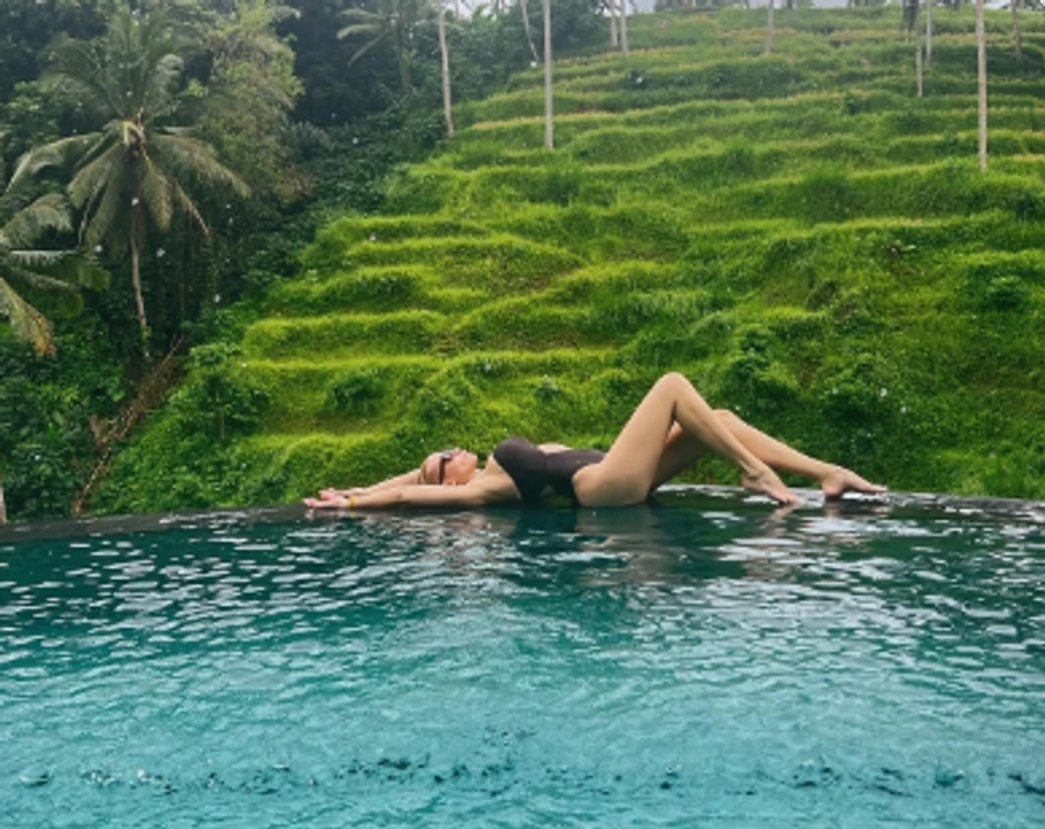 Ona je maksimalno iskoristila vreme za uživanje, a sada je pokazala kako pliva na kiši što joj nimalo nije smetalo, a onda je pozirala na ivici bazena u jednodelnom kupaćem kostimu koji je savršeno istakao njene obline.