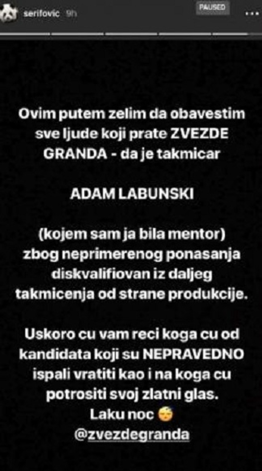 - Ovim putem želim da obavestim sve ljude koji prate Zvezde Granda, da je takmičar Adam Labunski (kojem sam ja bila mentor), zbog neprimerenog ponašanja, diskvalifikovan iz daljeg takmičenja od strane produkcije. Uskoro ću vam reći koga ću od kandidata koji su nepravedno ispali vratiti, kao i na koga ću potrošiti svoj zlatni glas - napisala je Marija.