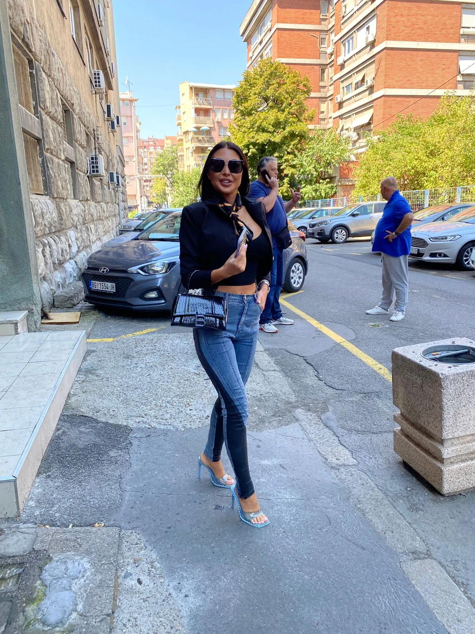 Ona je obukla crnu kratku majicu, koja joj je otkrila stomak, ali i pokazala pozamašno poprsje. Takođe, nosila je tanga farmerke koje nisu nimalo prikladne za ustanovu u koju je krenula.