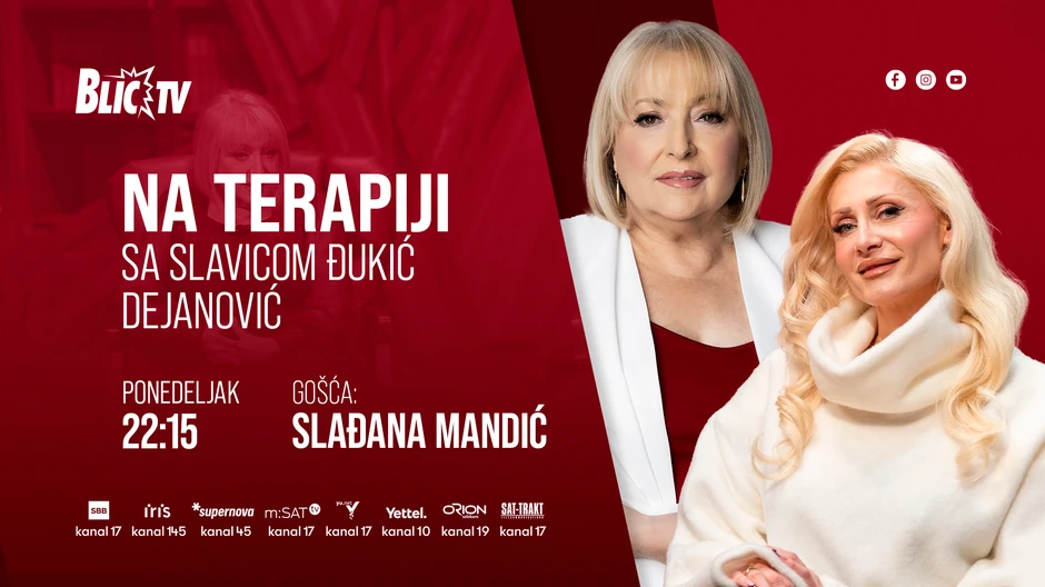 Pevačica Slađana Mandić gošća je emisije "Na terapiji sa Slavicom Đukić Dejanović" koju možete gledati večeras, u ponedeljak u 22.15 sati samo na Blic televiziji.