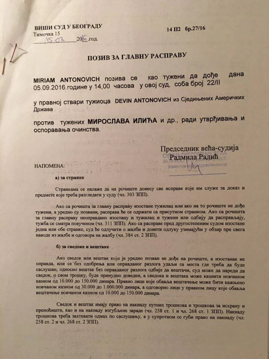 Sud u Srbiji nije uzeo u obzir dokaz koji je Mirjana Antonović podnela jer je reč o krišom urađenoj analizi DNK u Americi. Zato su Mirjana i Devin pokrenuli postupak u Srbiji i nadaju se da će se na sudu 5. septembra pojaviti i Miroslav Ilić.