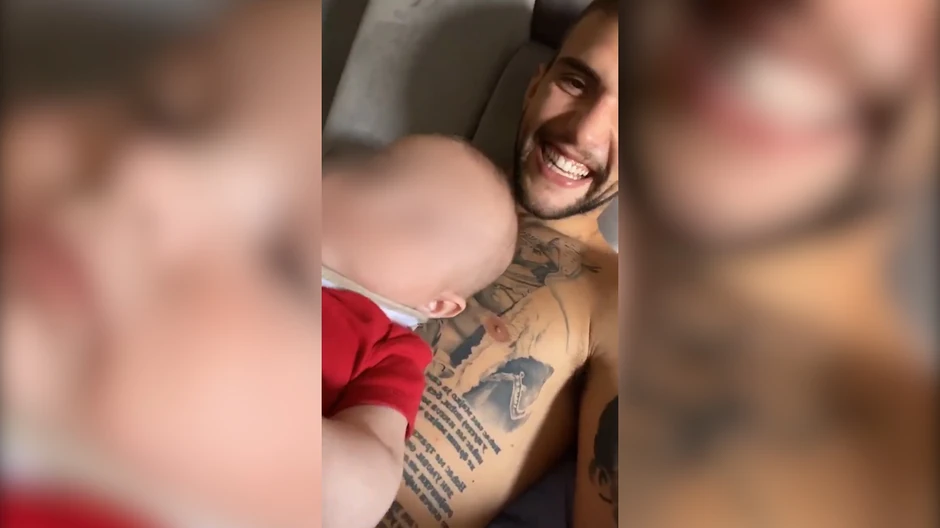 Mladi bokser igrao se sa mezimcem, kog je držao u naručju, a u jednom trenutku je počeo da se igra sa njegovim obrazima.