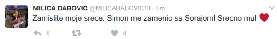- Zamislite moje sreće. Simon me zamenio Sorajom. Srećno mu - napisala je Milica, a fanovi su joj uputili poruke podrške pre nego što je obrisala tvit.