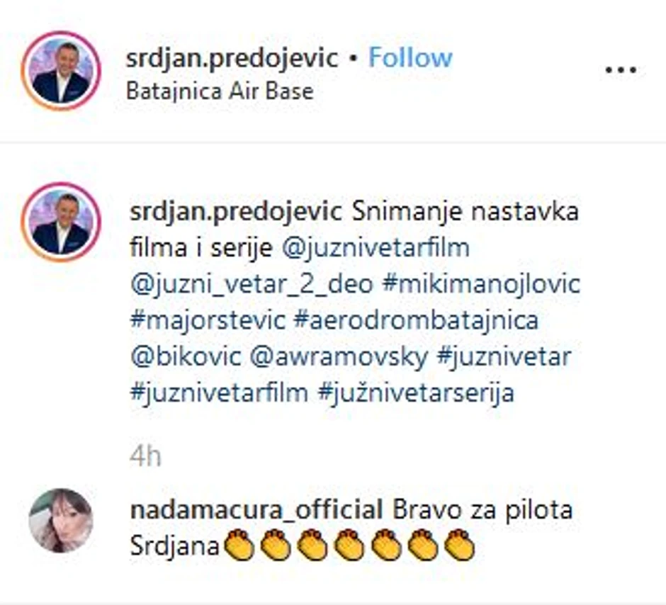 Predojević je na svoj Instagram profil postavio fotke sa Batajničkog aerodroma, nastale na snimanju poznatog ostvarenja, a nema sumnje da mu je čast što sarađuje na tako uspešnom projektu.
