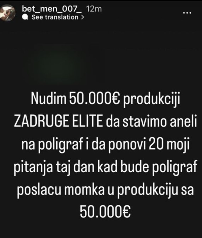 - Nudim 50.000 evra produkciji da stavimo Aneli na poligraf i da ponovi 20 mojih pitanja taj dan kad bude bio poligraf. Poslaću momka u produkciju sa 50.000 evra - napisao je Asmin Durdžić.
