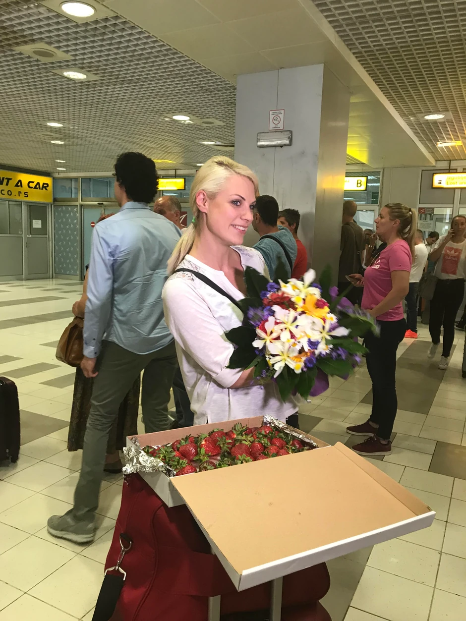 Ekipu su sačekali Nevenini roditelji sa cvećem i kutijom rashlađenih jagoda, a kada su videle doček sve tri su se rasplakale.