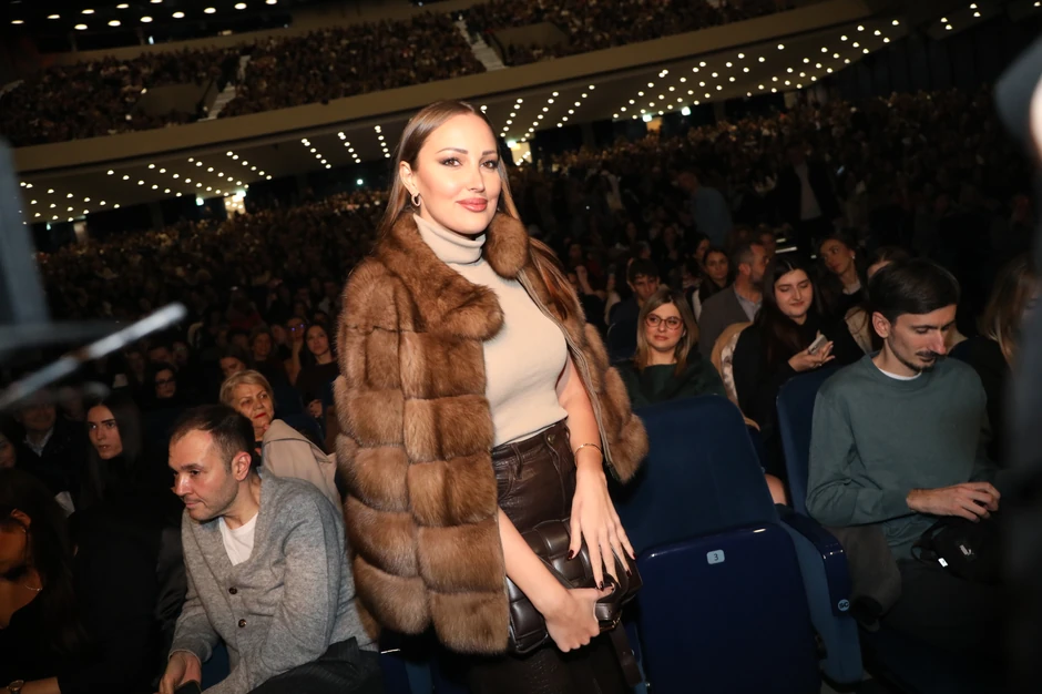 Pevačica je za ovu priliku obukla braon kožnu suknju, braon rolku i skupocenu bundu koju je samo ogrnula. Bila je vidno raspoložena, a na samom početku je spomenula koncert Saše Kovačevića na kom je bila nedavno.