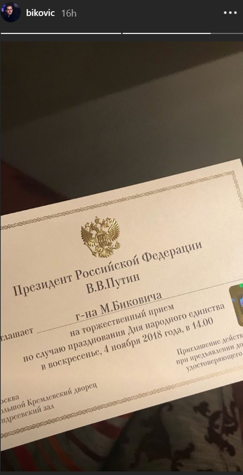 Biković se na ruskom jeziku zahvalio predsedniku Putinu i čestitao Dan narodnog jedinstva i na Instagramu se pohvalio pozivnicom koju je dobio za ovaj događaj.