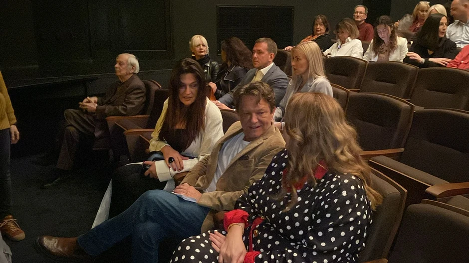 Glumac je zauzeo svoje mesto u prvom redu u pozorišnoj sali, gde je sa suprugom razmenio par reči.
