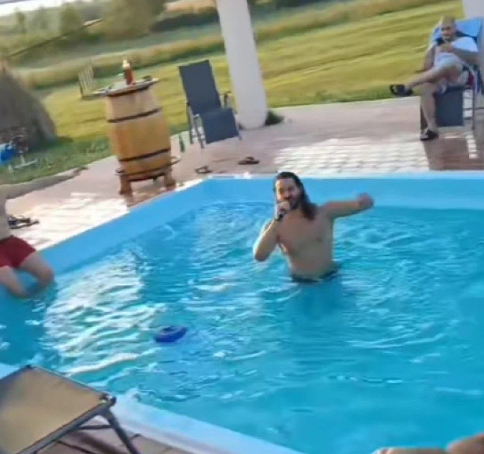 Naime, on je skočio u bazen sa mikrofonom i iz istog zabavljao prisutne goste.