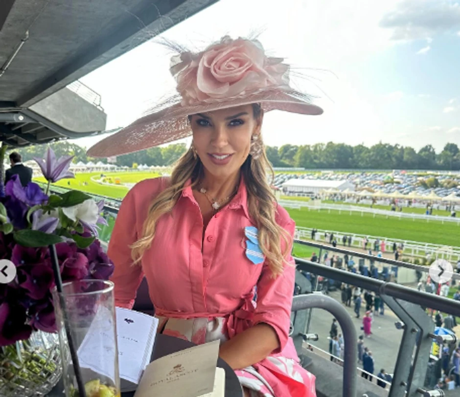 Marijana Mateus za ovu priliku obukla je roze haljinu sa cvetnim dezenom, obula štikle, kao i nezaobilazni šešir i to sa ružom.