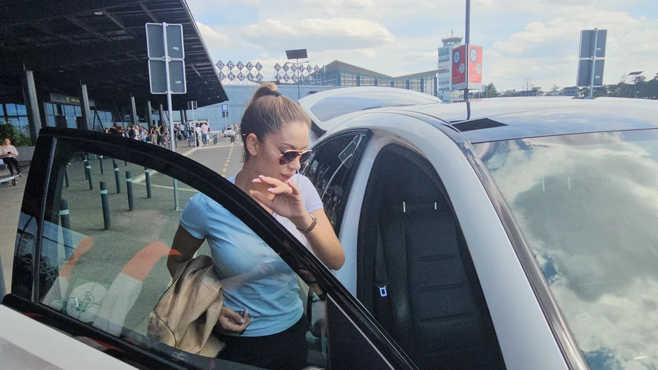 Pevačica se vraćala sa nastupa koje je imala u inostranstvu, a na aerodromu smo je zatekli u opuštenom izdanju- crnim helankama i bež manjici kratkih rukava. Tea je imala pokupljenu kosu, a lice je sakrila tamnim naočarama za sunce.