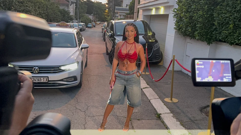 Naime, Teodora je za ovu priliku obukla teksas bermude i crveni brus, koji je ukrašen perlama u istoj boji.