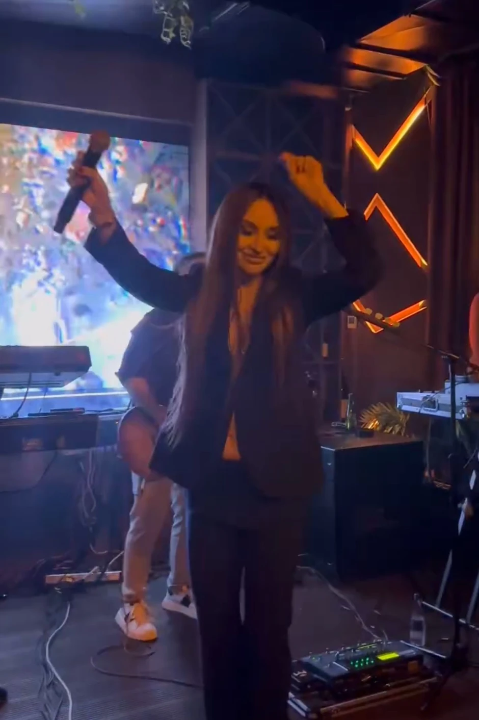 Ona je za ovu priliku odabrala odelo, dok je širokim sakom pokušavala da prikrije stomak. Međutim, kada je zaigrala i podigla ruke video joj se go stomačić.