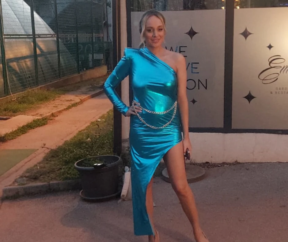 Trudna Luna obukla je dugačku plavu haljinu sa šlicem do kuka, koja se presijavala, a svi su joj gledali u trudnički stomak koji se jasno nazirao i preko kojeg su išli lanci kao modni detalj.