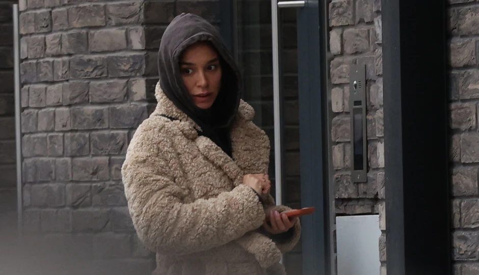 Ubrzo smo videli i Editu kako uprkos hladnoći i minusu, u debelom kaputu i trenerci šeta svoja dva ljubimca. Očigledno joj se nije žurilo, pa je laganim hodom prilazila svojoj zgradi, nasmejana, neprestano gledajući u telefon.