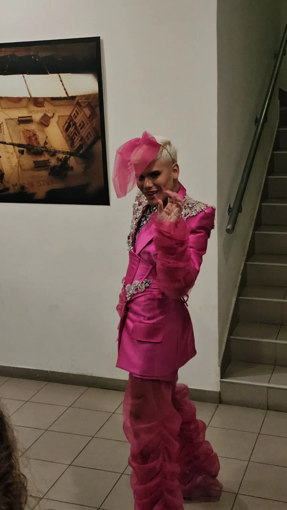 Na glavu je stavio rajf sa roze mrežicom, a pokazao je i predugačke nokte u roze boji.