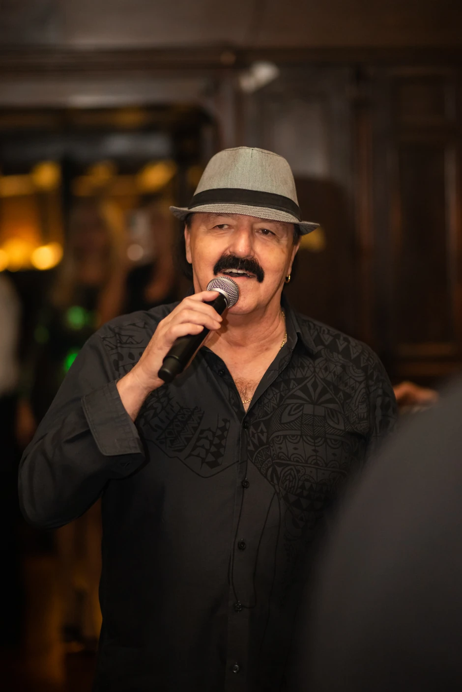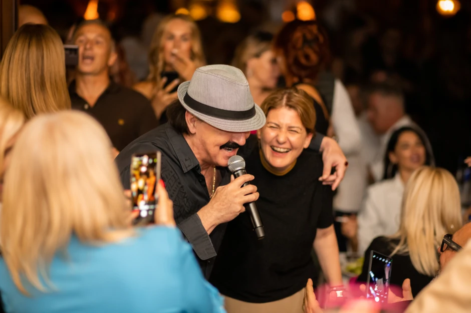 Pevač se pojavio u crnoj košulji, bio vidno raspoložen, a čim se pojavio u sali restorana publika ga je dočekala ogromnim aplauzom.