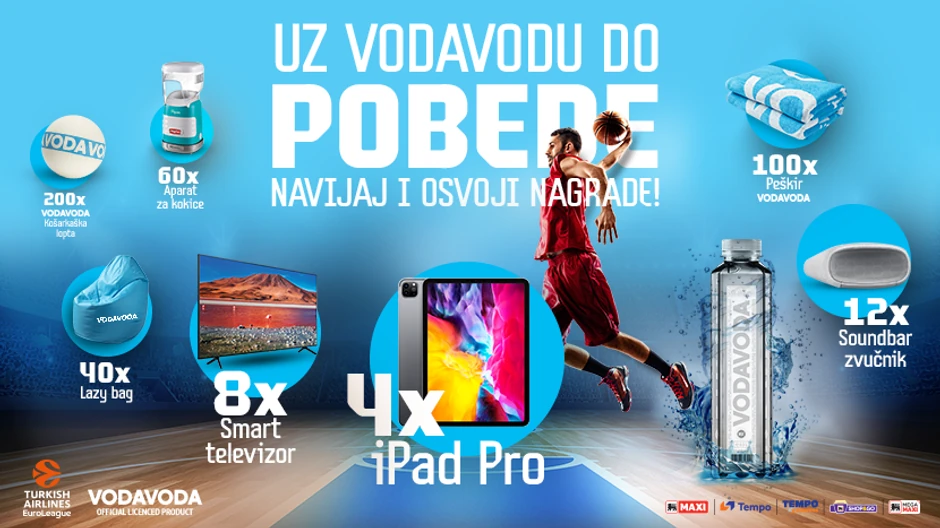 Zbog toga je VODAVODA osigurala više od 400 vrednih nagrada – smart televizore, iPad pro uređaje, saundbar zvučnike, lejzi begove i brojne druge - kako bi verni fanovi najkvalitetnije evropske košarke i arteške vode, finale košarkaškog spektakla i ove godine gledali sa istim žarom, kao iz sportske dvorane!