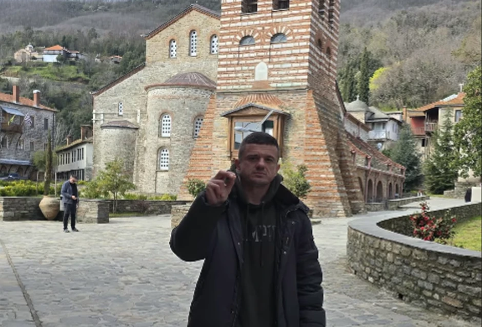 Miloš Stojanović Tigar obišao je manastire na Svetoj gori, a onda se fotografisao ispred Hilandara i podigao tri prsta.