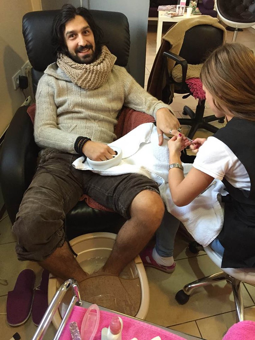Dok mu sređuju nokte na ruka, odnosno dok mu rade manikir, Veljko kiseli noge očekujući pedikir.
